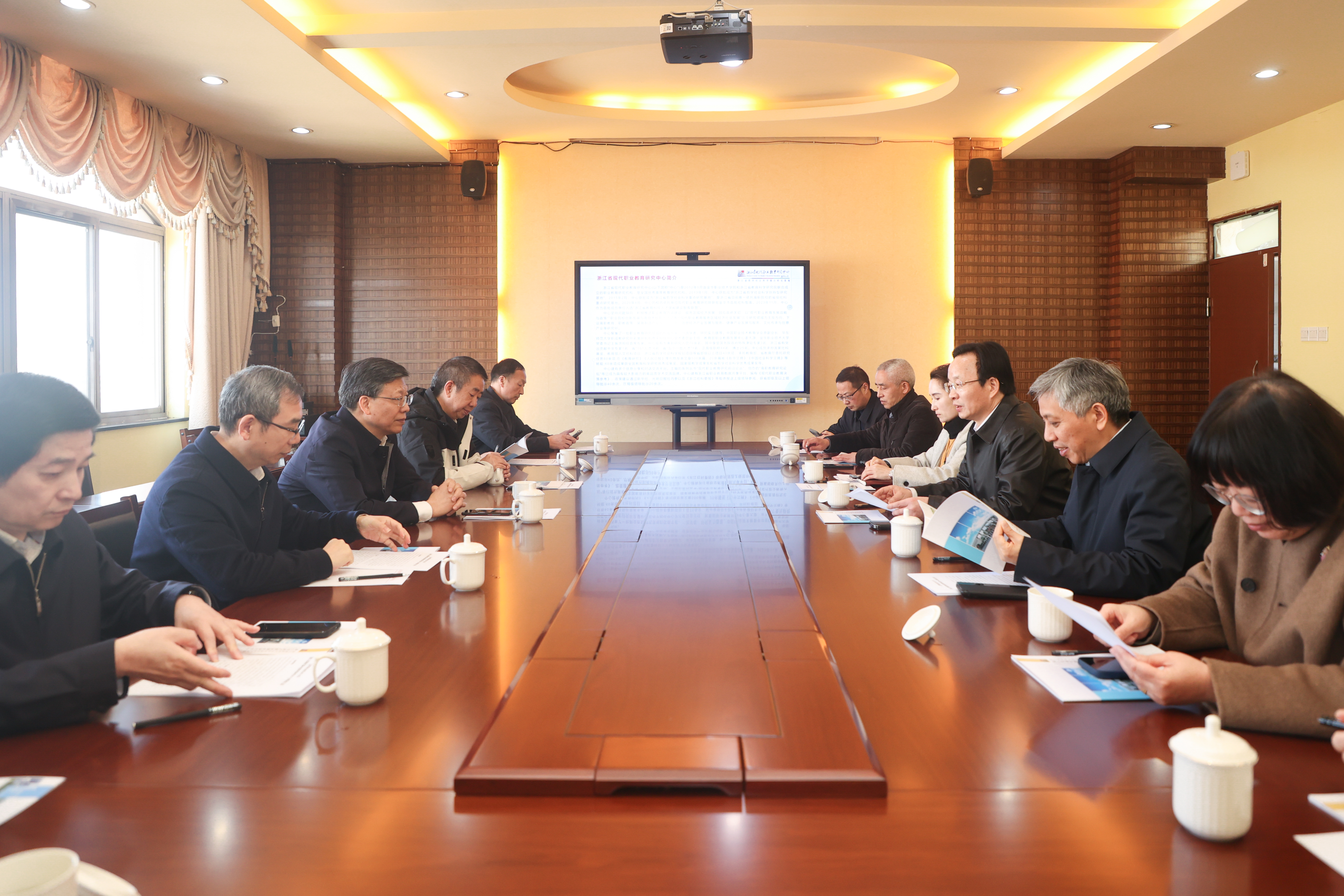 陈根芳听取了学校关于《条例》的落实实施、社科平台建设等相关汇报,对学校在贯彻落实《条例》、深耕职教特色、推进哲学社会科学研究与智库建设等方面取得的成效予以高度评价。他强调,要持续用好《条例》法治保障,做强社科智库平台,推动研究与地方产业需求精准对接,不断提升社科研究服务区域发展的能力与水平。同时,他提出,地方政府要加大对学校的基础投入,对标省属院校投入标准完善配套政策;学校要锚定世界一流职业院校建设目标,加快学科建设、学位点布局,深化与地方龙头企业、链主企业合作,创新人才引育机制,聚焦应用型人才培养深耕细研,扎实推进省级一流智库创建,稳步向国家高端智库建设目标迈进,为浙江哲学社会科学高质量发展贡献更大力量。