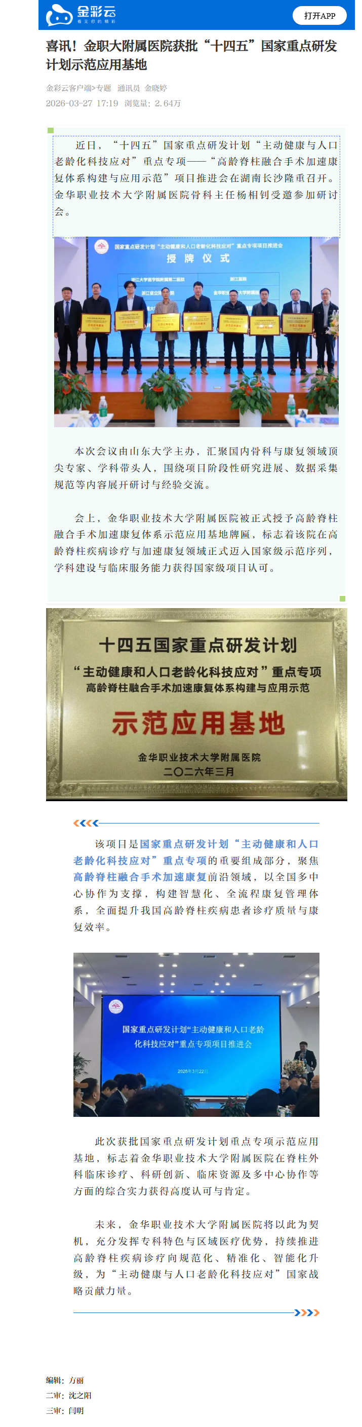 金彩云客户端:喜讯!金职大附属医院获批“十四五”国家重点研发计划示范应用基地