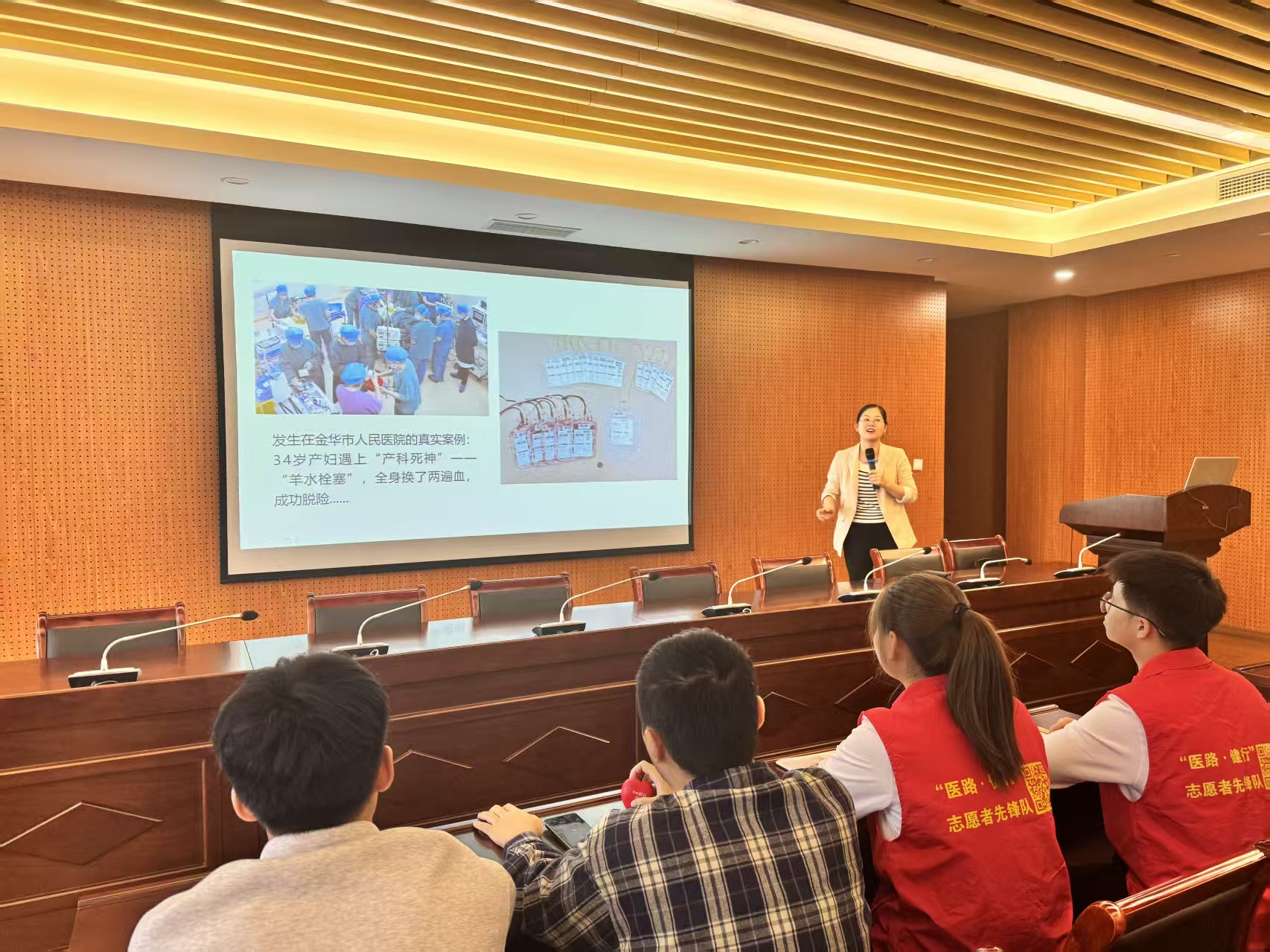 宣讲环节,医学院暖阳护助党支部书记以市人民医院产妇刘女士羊水栓塞的生死救援案例为切入点,生动展现党组织引领下的医疗担当:危急时刻,医院党委第一时间启动应急响应机制,组建党员先锋救援小组,医护人员冲锋在前,4小时抢救中累计输注10000ml血制品——相当于为患者完成全身血液两次“更替”,最终从死神手中夺回生命。“每一袋无偿献血的血液,都是连接党和群众的‘红色纽带’,既承载着献血者的爱心,更体现着党‘以人民为中心’的发展思想。”她进一步强调,医学生要深刻领会党的卫生健康工作方针,不仅要掌握专业知识,更要将“敬佑生命、救死扶伤、甘于奉献、大爱无疆”的职业精神与党的为民宗旨紧密结合。作为学生骨干,更要主动扛起责任,既要做政策宣讲的“传声筒”,向身边同学普及无偿献血的重要意义;也要做实践行动的“带头人”,积极参与志愿服务,真正把政策认知转化为服务群众的自觉行动,让“献血即救命”的理念在校园落地生根。