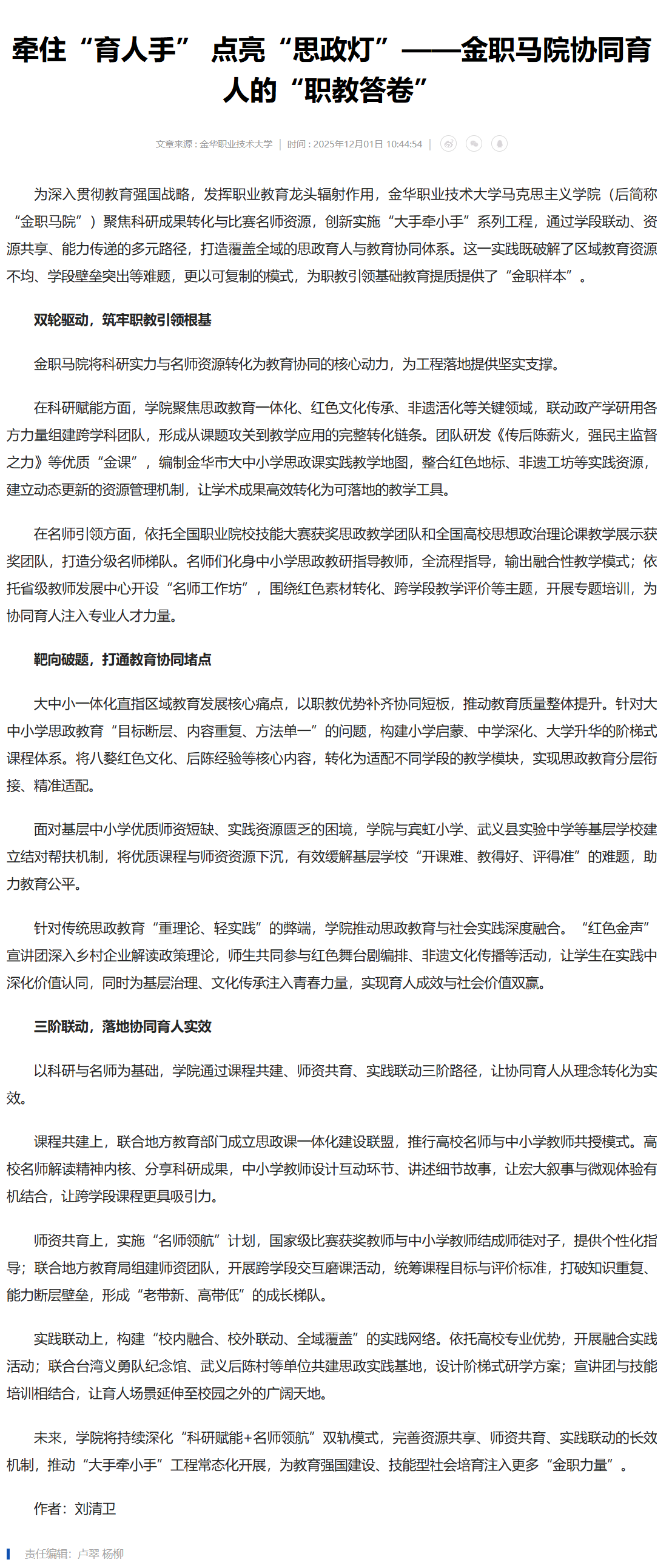 中国教育在线:牵住“育人手” 点亮“思政灯”——金职马院协同育人的“职教答卷”