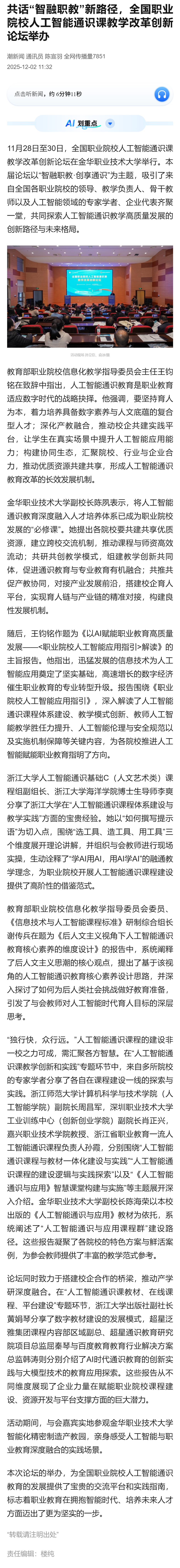 潮新闻:共话“智融职教”新路径,全国职业院校人工智能通识课教学改革创新论坛举办