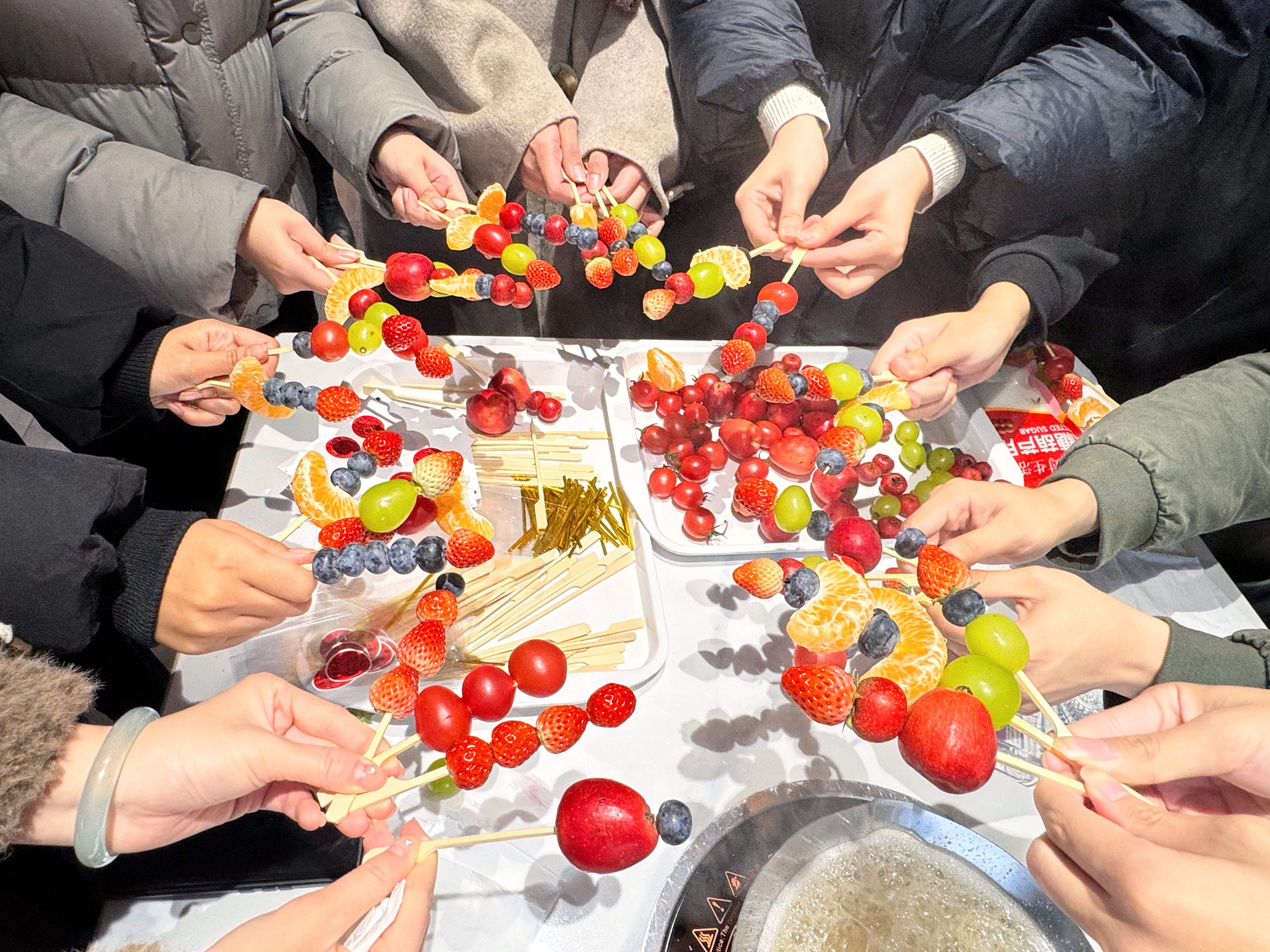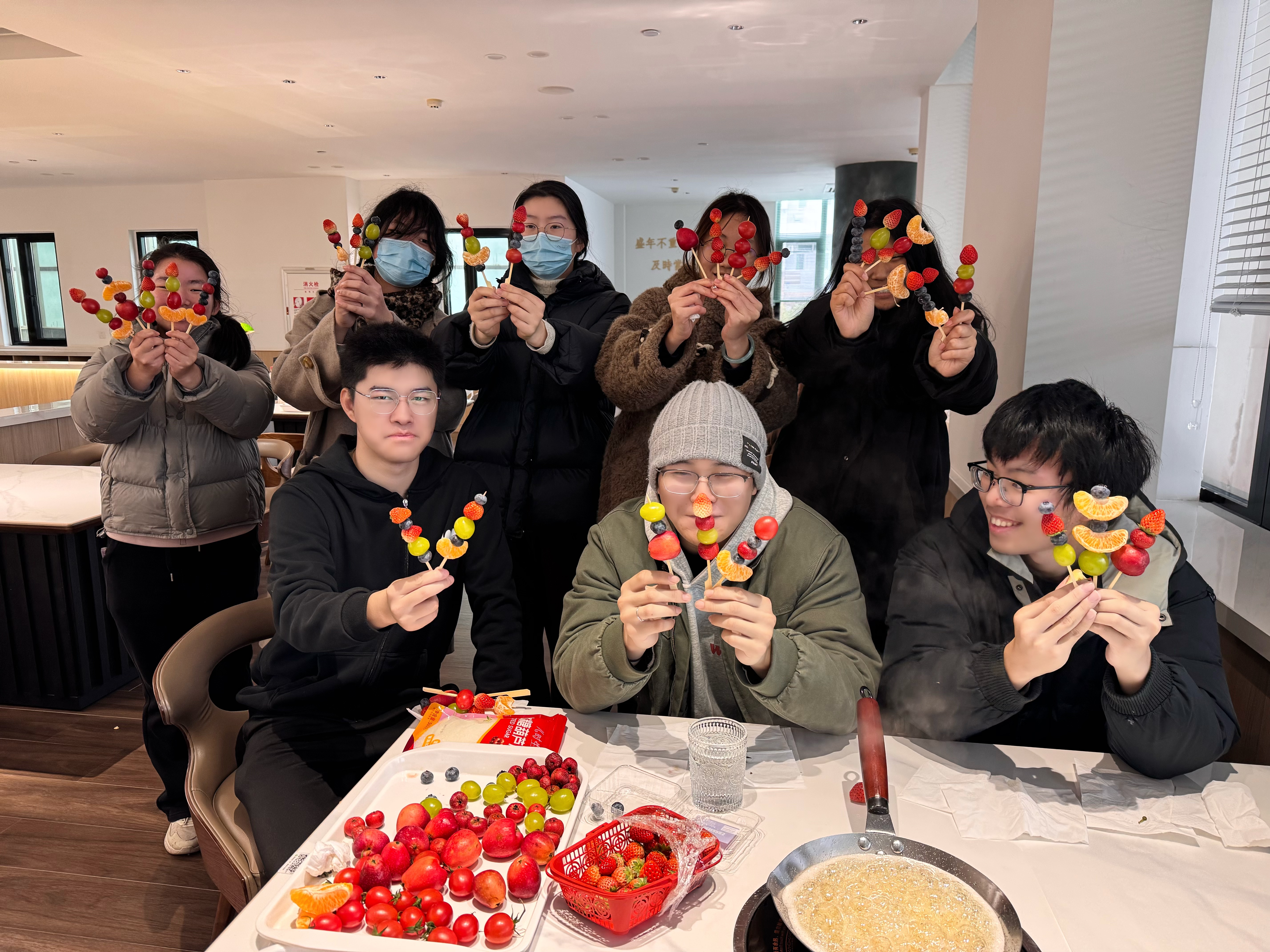 活动现场氛围热烈、温馨有序。学院精心准备了山楂、草莓、蓝莓、橘子、晴王葡萄等多种新鲜食材及现场熬制的糖浆。同学们在指导下亲手串制、挂糖,创作出各具特色的糖葫芦,彼此交流协作,笑声不断。一位参与同学表示:“活动参与感特别强,动手又动脑,很喜欢这种形式,已经开始期待下次了!”