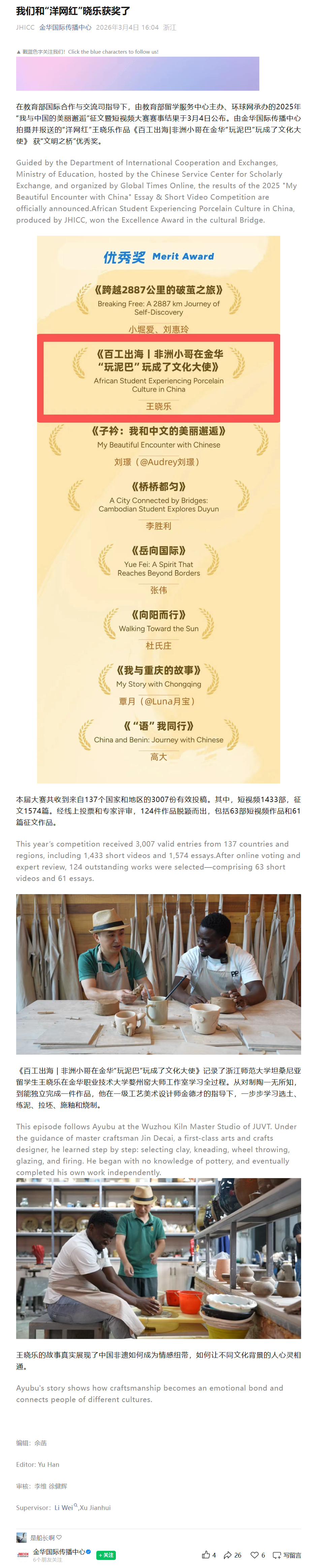 金华国际传播中心:我们和“洋网红”晓乐获奖了