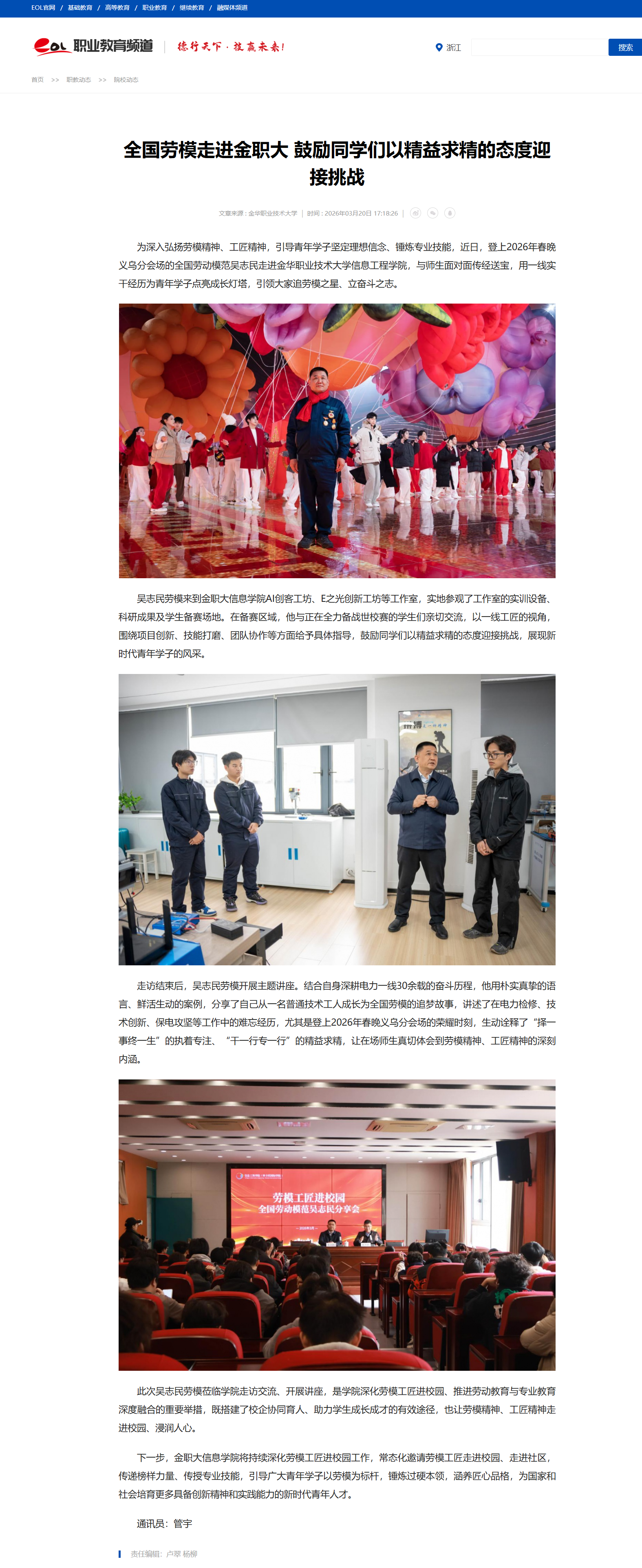 中国教育在线:全国劳模走进金职大 鼓励同学们以精益求精的态度迎接挑战