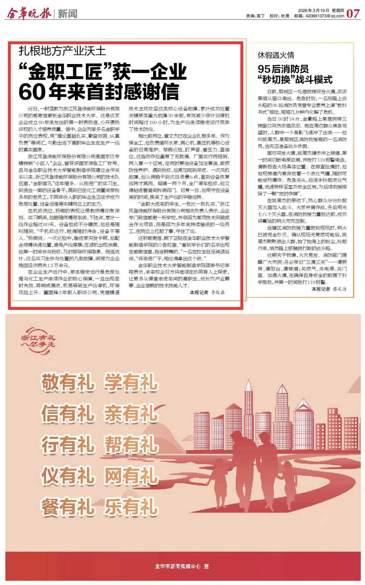 金华晚报:扎根地方产业沃土“金职工匠”获一企业 60年来首封感谢信