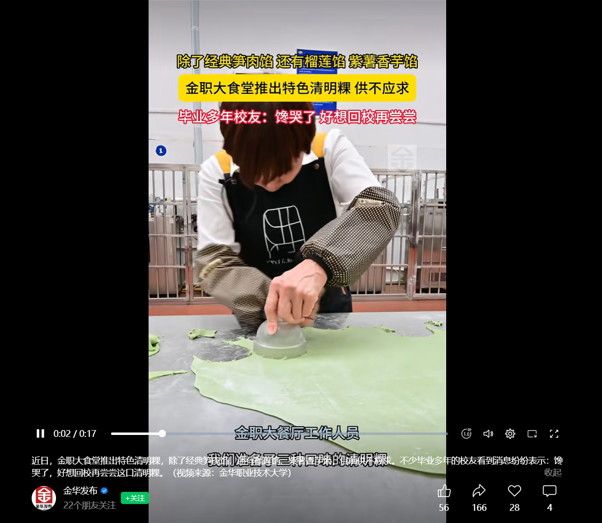 金华发布:近日,金职大食堂推出特色清明粿,除了经典笋肉馅,还有榴莲馅、紫薯香芋馅,目前供不应求。不少毕业多年的校友看到消息纷纷表示:馋哭了,好想回校再尝尝这口清明粿。(视频来源:金华职业技术大学)