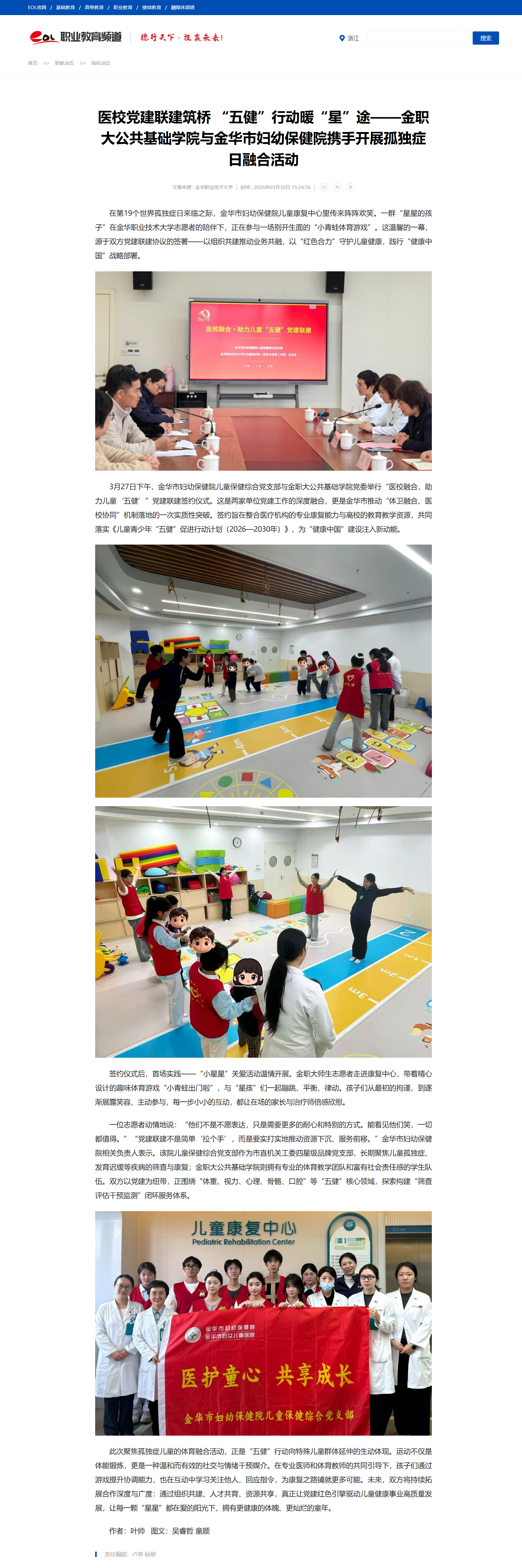 中国教育在线:医校党建联建筑桥 “五健”行动暖“星”途——金职大公共基础学院与金华市妇幼保健院携手开展孤独症日融合活动