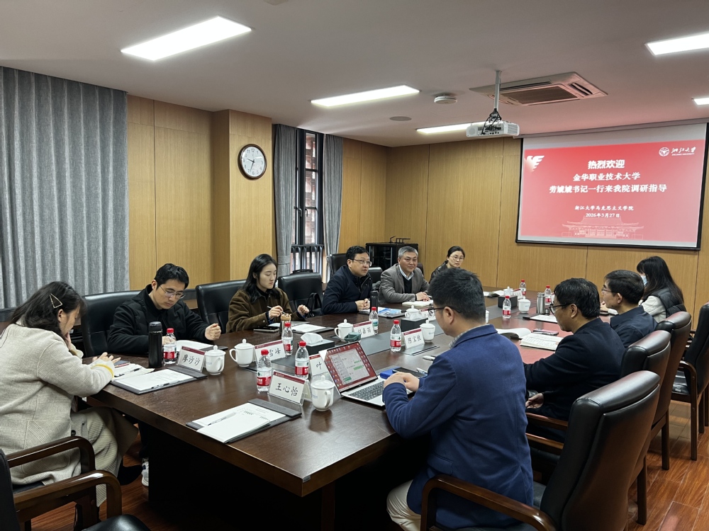 为科学谋划“十五五”发展规划,推动学院内涵式高质量发展,3月27日,金华职业技术大学党委副书记劳虓虓带队,马克思主义学院相关负责人一行,先后赴浙江大学马克思主义学院和浙江金融职业学院马克思主义学院开展调研交流。此次调研旨在对标国内顶尖及省内兄弟院校的先进经验,进一步解放思想、拓宽视野,为学院在新征程上实现跨越式发展凝聚智慧与力量。