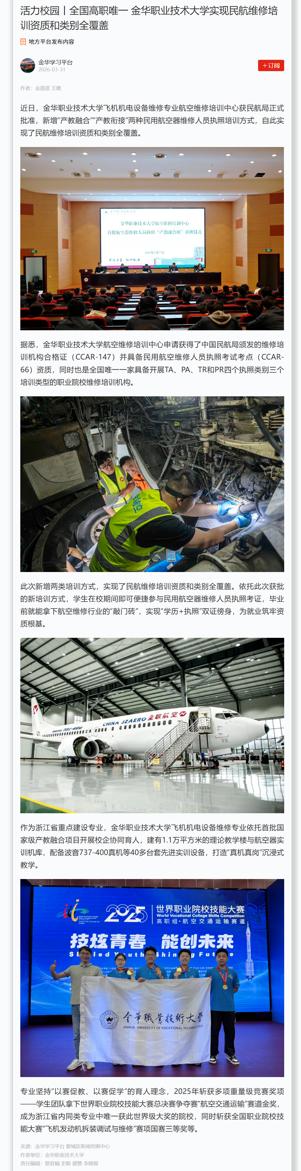 学习强国 金华学习平台:活力校园丨全国高职唯一 金华职业技术大学实现民航维修培训资质和类别全覆盖