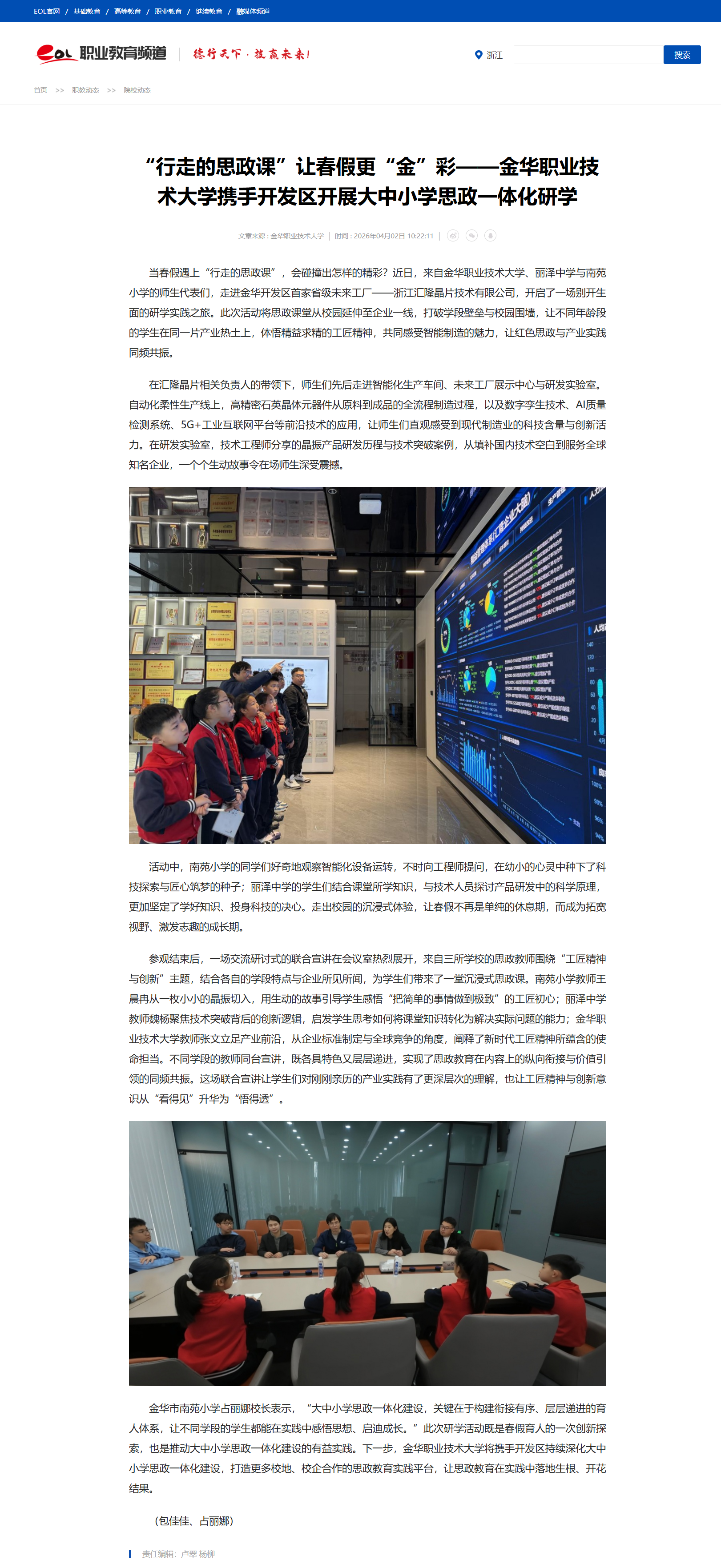 中国教育在线:“行走的思政课”让春假更“金”彩——金华职业技术大学携手开发区开展大中小学思政一体化研学