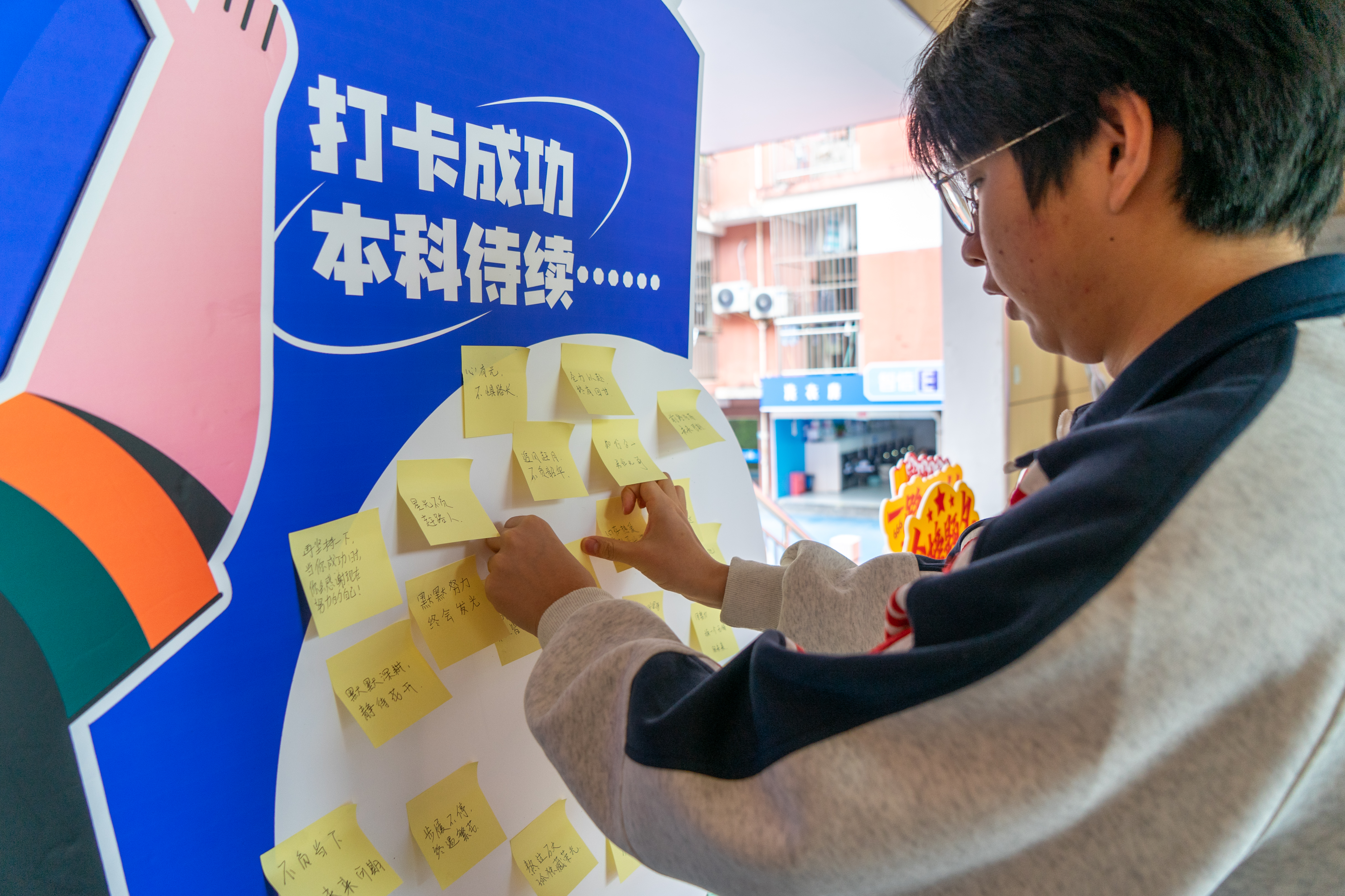 同时,学院设置主题打卡墙,同学们纷纷拿起便利贴,写下专属自己的备考心声和期许,一张张写满热忱与坚定的便签层层贴满墙面,汇聚成冲刺路上最温暖的集体力量,也定格下大家奔赴理想的青春模样。