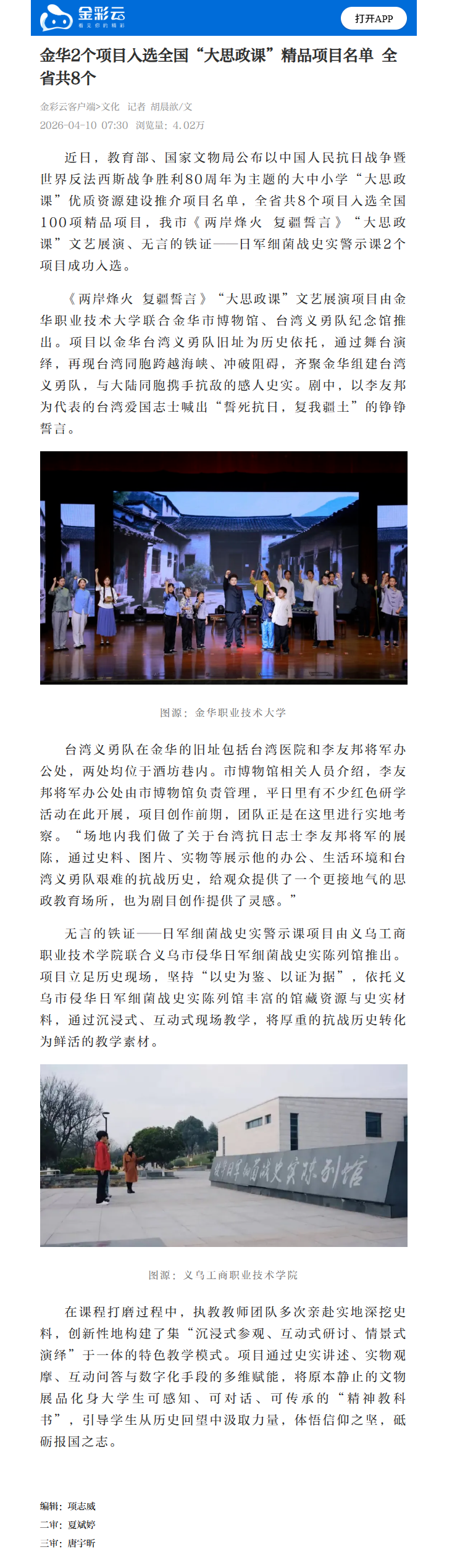 金彩云客户端:金华2个项目入选全国“大思政课”精品项目名单 全省共8个